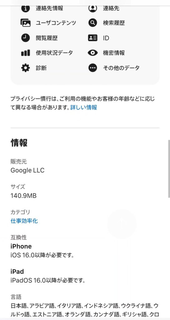 ※Google LLCが見当たらない場合はそのまま下にスクロールして「情報」のところに販売元(デベロッパー名)が書かれています。