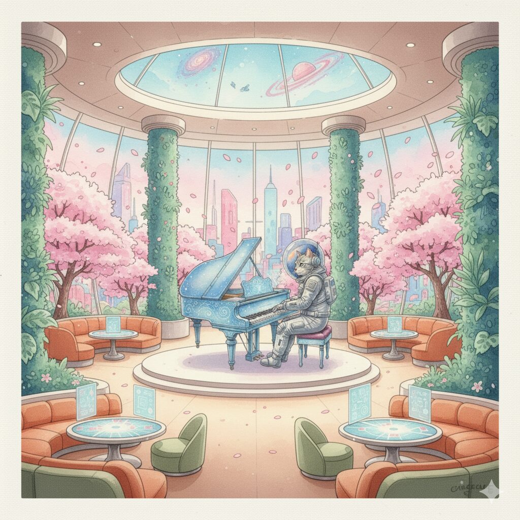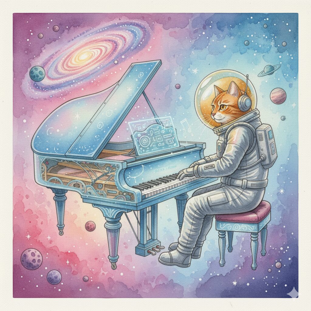 例:「宇宙服を着た猫がピアノを弾いている画像を作成して」