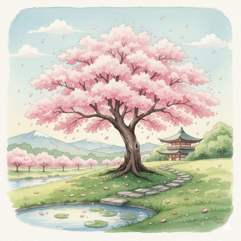 例:「桜の木が満開の、水彩画のようなイラストを作成して」