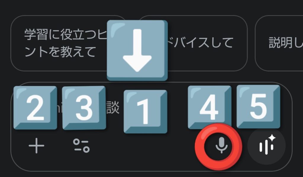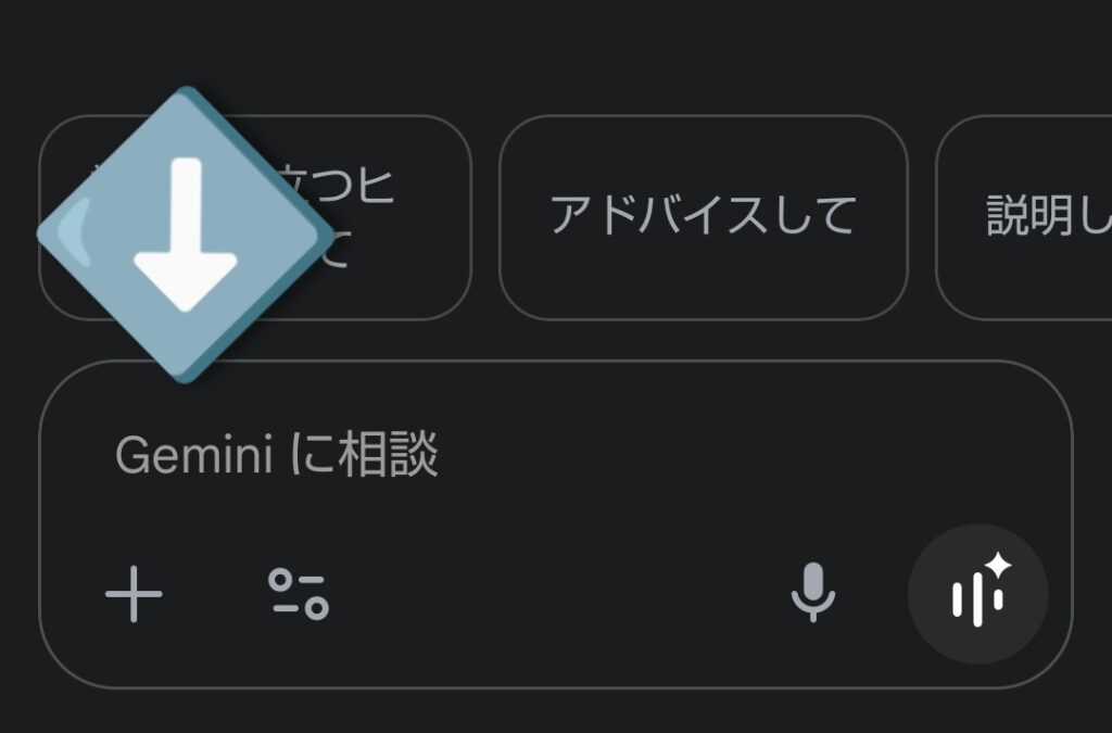 画面下のボックス↓(Geminiに相談の部分)に質問や依頼を入力して、送信ボタン(右に出る紙飛行機のマーク)をタップするだけです。