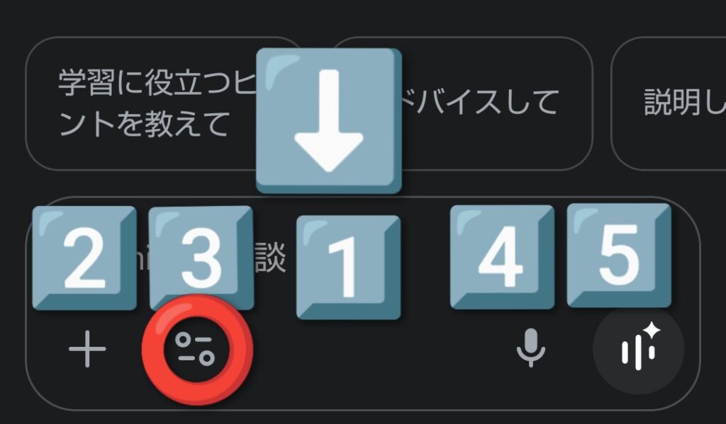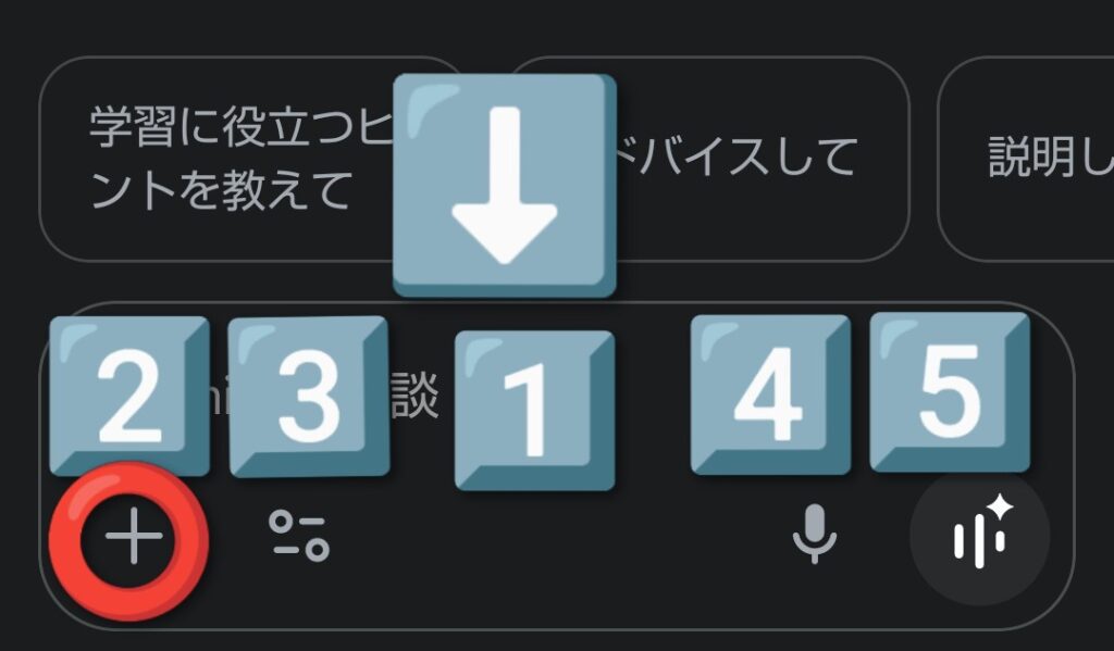 2⃣.の+ボタン:カメラアイコンをタップして写真を選択または撮影をしてみよう。Geminiが画像を分析して回答します。