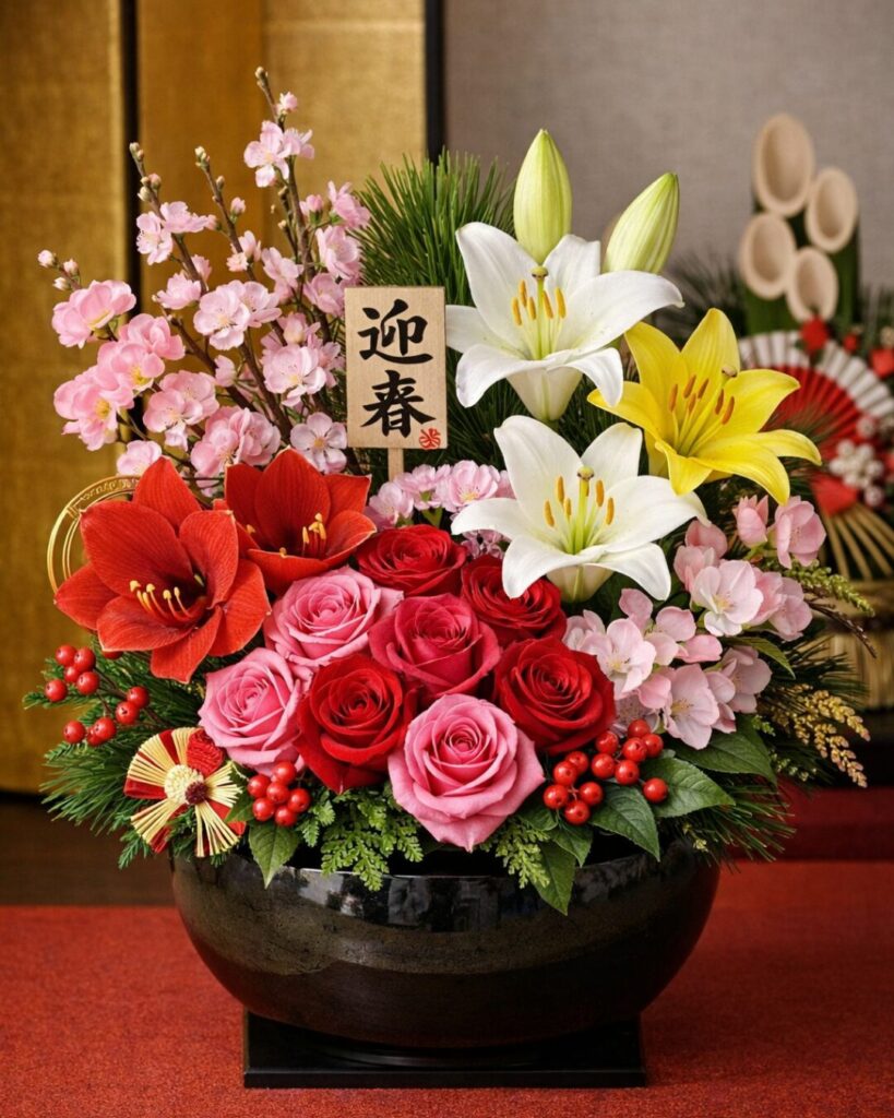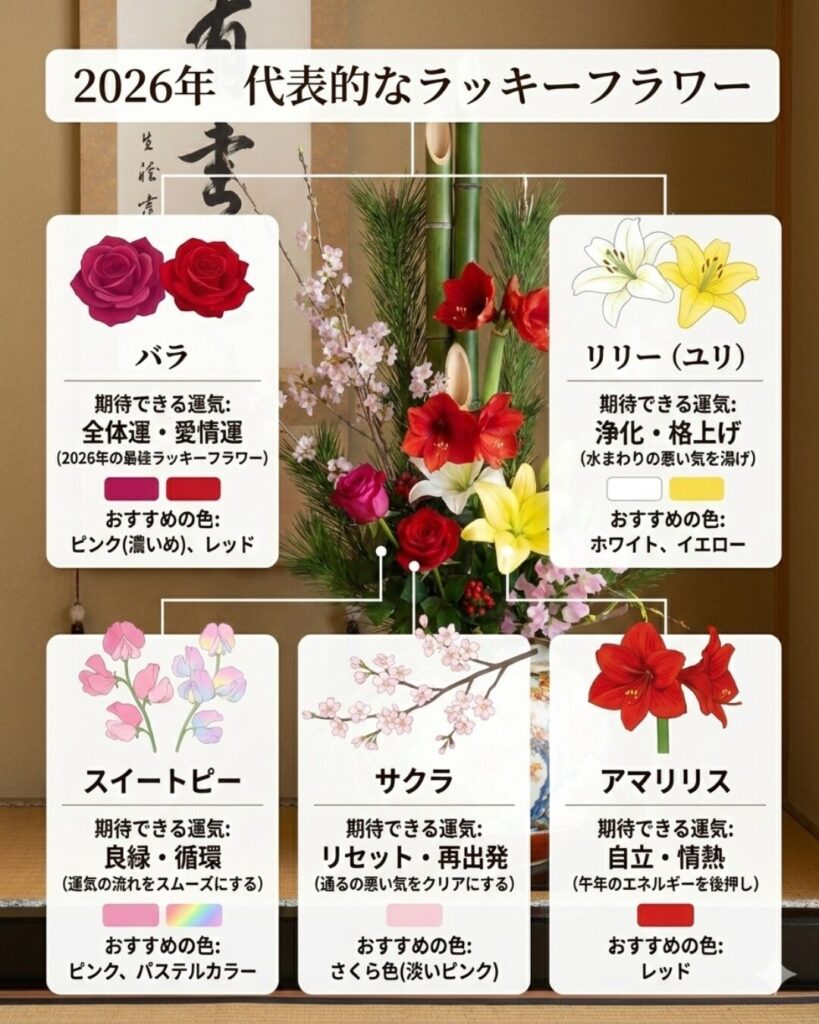 また今年は「植物」「花」がラッキーアイテムと仰る占い師の方もおられたので、「火」と「水」の力をできる限り引き出そうと、おまけでラッキーフラワーも調べると以下の図解のようになりました。縁起の良い花を活けるとこんな感じでしょうか。